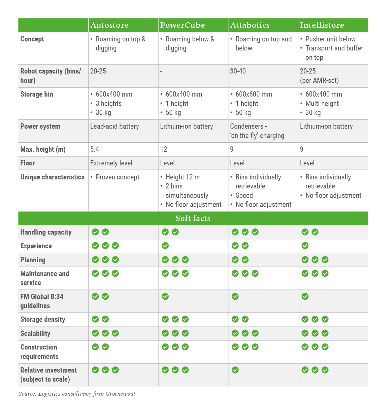 Dirk Becks, senior consultant at logistics consultancy firm Groenewout, has compared various goods-to-person cube storage systems and summarized their main characteristics and pros and cons in the table below.